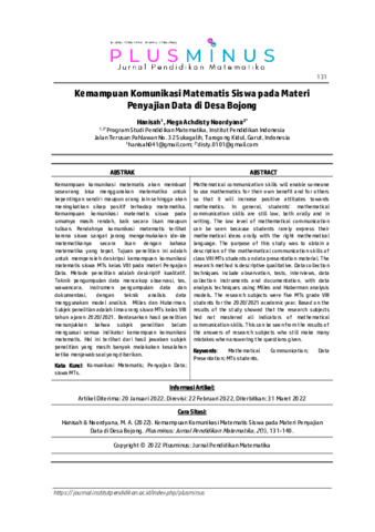 Hanisah, Hanisah and Mega, Achdisty Noordyana (2022) Kemampuan komunikasi matematis siswa pada materi penyajian data di Desa Bojong. Plusminus: Jurnal Pendidikan Matematika, 2 (1): 12. pp. 131-140. ISSN 2798-2904