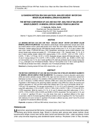 Supriyanto, C. and Sukirno, Sukirno and Samin, Samin (2015) UJI BANDING METODE SSA DAN AAN PADA ANALISIS UNSUR MAYOR DAN MINORDALAM MINERAL ZIRKON KALIMANTAN. Ganendra, 18 (1). pp. 35-43. ISSN p-ISSN: 1410-6957, e-ISSN: 2503-5029