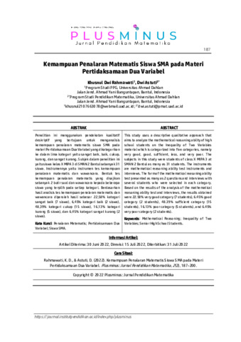 Khusnul, Dwi Rahmawati and Dwi, Astuti (2022) Kemampuan penalaran matematis siswa SMA pada materi pertidaksamaan dua variabel. Plusminus: Jurnal Pendidikan Matematika, 2 (2): 2. pp. 187-200. ISSN 2798-2904