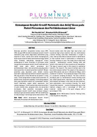Rini, Fauziah Sari and Ekasatya, Aldila Afriansyah (2022) Kemampuan berpikir kreatif matematis dan belief siswa pada materi persamaan dan pertidaksamaan linear. Plusminus: Jurnal Pendidikan Matematika, 2 (2): 10. pp. 275-288. ISSN 2798-2904