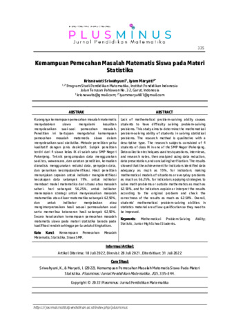 Krisnawati, Sriwahyuni and Iyam, Maryati (2022) Kemampuan pemecahan masalah matematis siswa pada materi statistika. Plusminus: Jurnal Pendidikan Matematika, 2 (2): 15. pp. 335-344. ISSN 2798-2904