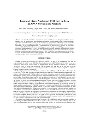 Rian Suari Aritonang and Agus Bayu Utama and Awang Rahmadi Nuranto (2021) Load and Stress Analysis of POD Part on LSA (LAPAN Surveillance Aircraft). In: The 8th International Seminar on Aerospace Science and Technology – ISAST, 17 November 2020, Bogor, Indonesia.