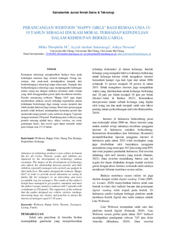 Milka, Theophilia M. and Ayyub, Anshari Sukmaraga and Aditya, Nirwana (2022) Perancangan Webtoon Happy Girls bagi remaja usia 15 hingga 19 tahun sebagai edukasi moral terhadap kepedulian dalam kehidupan berkeluarga. Sainsbertek Jurnal Ilmiah Sains & Teknologi, 3 (1): 5. pp. 52-74. ISSN 2797-1244