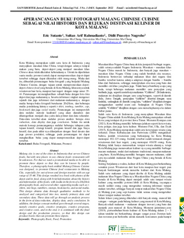 Eric, Sutanto and Sultan, Arif Rahmadianto and Didit, Prasetyo Nugroho (2022) Perancangan buku fotografi Malang Chinese Cuisine sebagai nilai historis dan rujukan destinasi kuliner di Kota Malang. Sainsbertek Jurnal Ilmiah Sains & Teknologi, 3 (1): 4. pp. 40-51. ISSN 2797-1244