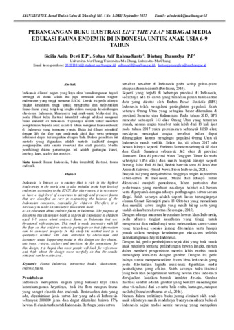 Sicilia, Anita Dewi E.P and Sultan, Arif Rahmadianto and Bintang, Pramudya P.P (2022) Perancangan buku ilustrasi lift the flap sebagai media edukasi fauna endemik di Indonesia untuk anak usia 6 -9 tahun. Sainsbertek Jurnal Ilmiah Sains & Teknologi, 3 (1): 8. pp. 109-123. ISSN 2797-1244