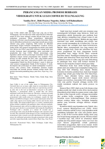 Yustika, Dewi and Didit, Prasetyo Nugroho and Sultan, Arif Rahmadianto (2022) Perancangan media promosi berbasis videografi untuk Lugo Coffee di Tulungagung. Sainsbertek Jurnal Ilmiah Sains & Teknologi, 3 (1): 10. pp. 136-151. ISSN 2797-1244