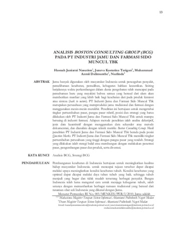 Dita, Rismananda and Marlya, Fatira AK and Muhammad, Zuhirsyan (2021) Analisis boston consulting group (BCG) pada PT Industri Jamu dan Farmasi Sido Muncul Tbk. Majalah Iptek Politeknik Negeri Medan Polimedia, 24 (1): 2. pp. 13-22. ISSN 1410-7422