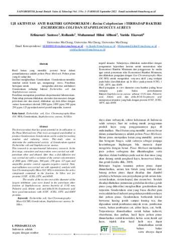 Erlinawati o, Santoso and Rollando, Rollando and Muhammad, Hilmi Afthoni and Yurida, Ekawati (2022) Uji aktivitas anti bakteri gondorukem (Resina Colophonium) terhadap bakteri Escherichia coli dan Staphylococcus aureus. Sainsbertek Jurnal Ilmiah Sains & Teknologi, 3 (1): 21. 280 -291. ISSN 2797-1244