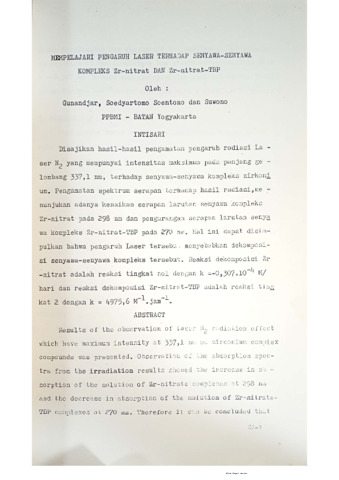 Gunandjar and Soedyartomo Soentono and Suwono (1983) Mempelajari pengaruh laser terhadap senyawa - senyawa kompleks Zr - nitrat - TBP. Proceeding lokakarya kimia dan teknologi pemurnian bahan nuklir (kelompok kimia) 1983: C2. pp. 1-25.