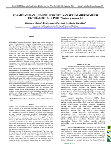 Zahratun, Khaira and Eva, Monica and Chresiani, Destianita Yoesditira (2022) Formulasi dan uji mutu fisik sediaan serum mikroemulsi ekstrak biji melinjo (Gnetum gnemon L.). Sainsbertek Jurnal Ilmiah Sains & Teknologi, 3 (1): 23. pp. 299-309. ISSN 2797-1244