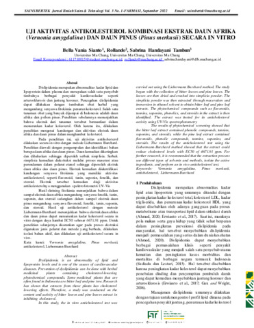 Bella, Vania Sianto and Rollando, Rollando and Sabrina, Handayani Tambun (2022) Uji aktivitas antikolesterol kombinasi ekstrak daun Afrika (Vernonia amygdalina) dan daun pinus (Pinus merkusii) secara in vitro. Sainsbertek Jurnal Ilmiah Sains & Teknologi, 3 (1): 25. pp. 322-333. ISSN 2797-1244