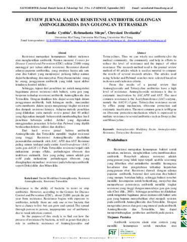 Eunike, Cynthia and Rehmadanta, Sitepu and Chresiani Destianita, Chresiani Destianita (2022) Review jurnal kajian resistensi antibiotik golongan aminoglikosida dan golongan tetrasiklin. Sainsbertek Jurnal Ilmiah Sains & Teknologi, 3 (1): 26. pp. 334-341. ISSN 2797-1244
