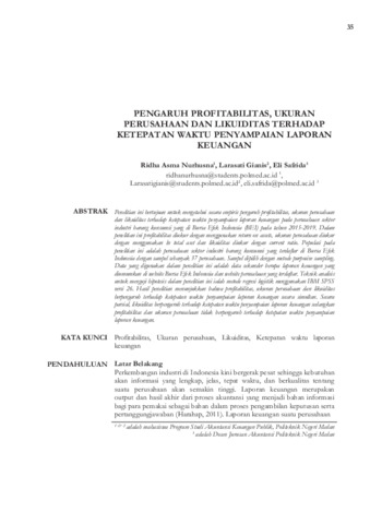 Ridha, Asma Nurhusna and Larasati, Gianis and Eli, Safrida (2021) Pengaruh profitabilitas, ukuran perusahaan dan likuiditas terhadap ketepatan waktu penyampaian laporan keuangan. Majalah Iptek Politeknik Negeri Medan Polimedia, 24 (2): 4. pp. 35-51. ISSN 1410-7422