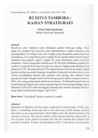 Penelitian situs Tambora telah dilakukan dalam beberapa tahap. Pada tahap ini terdapat hal menarik yaitu ditemukannya rangka manusia yang menampakkan ciri khusus lain dari rangka yang ditemukan pada penelitian sebelumnya. Ciri yang khusus dari rangka R2 ini adalah tidak seluruh bagian tubuhnya terarangkan seperti rangka RI yang ditemukan pada penelitian terdahulu, Untuk mengetahui kekhususan R2 tersebut dilakukan pendekatan analisis stratigrafi detail lapisan-lapisan yang tersingkap pada dinding kotak ekskavasi T7SI. Stratigrafi kotak T7SI dapat dirunut dari tua ke muda, adalah lapisan paling tua tanah lempung, kemudian di atasnya berturut-turut secara selaras terendapkan lapisan abu vulkanik, batu apung, abu vulkanik, batu apung bercampur dengan material lain berupapasir, tephra, fragmen andesit, lithic, dan yang paling muda adalah tanah humus. R2 ditemukan pada lapisan tanah lempung bagian atas sampai dengan lapisan batu apung sehingga dapat diketahui bahwa R2 telah meninggal sebelum fase letusan Gunung Tambora yang mulai terjadi pada tangga 5 April 1815