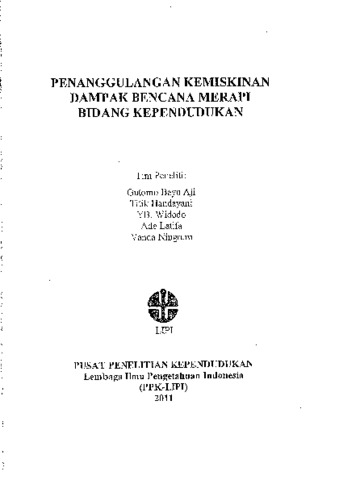 Gutomo Bayu, Aji and Titik, Handayani and YB, Widodo and Ade, Latifa and Vanda, Ningrum (2011) Penanggulangan kemiskinan dampak bencana Merapi bidang kependudukan. Project Report. Lembaga Ilmu Pengetahuan Indonesia, Jakarta.