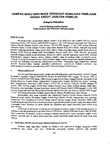 Penyempurnaan pengelolaan jabatan peneliti terus dilakukan dan terakhir kalinya melalui Keputusan Ketua LIPI Nomor 1660/D/1999 tanggal 13 Juli 1999 tentang Organisasi dan Tata Kerja Panitia Penilai Jabatan Peneliti, dan Nomor 1661/D/1999 tanggal 13 Juli 1999 tetang Pedoman Penilaian Karya Ilmiah Jabatan Peneliti yang lazim disebut Buku Biru Muda. Dampak keputusan tersebut terhadap penilaian angka kredit akan diteliti. Data yang digunakan adalah basil penilaian bulanan P2JP Nasional tahun 2000 dibandingkan dengan basil tahun 1998. Melalui pengujian statistik dengan metoda tanda sederhana, ditemukan bahwa, setelah keputusan Ketua LIPI tersebut diberlakukan semakin banyak berkas jabatan peneliti yang dinyatakan tidak memenuhi syarat. Temuan ini perlu diwaspadai karena basil penilaian angka kredit mempunyai dampak terhadap karir peneliti dan terhadap keberhasilan pelaksanaan penelitian. Disarankan agar pengelolaan jabatan peneliti disempurnakan melalui perbaikan administrasi, pembakuan kriteria penilaian, dan pelaksanaan komunikasi periodik antara P2JP Nasional dengan P2JP Instansi.