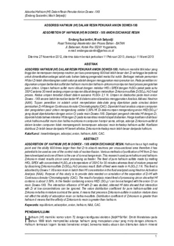 Hafnium memiliki titik lebur yang tinggi dan kemampuan menyerap neutron per luas penampang 600 kali lebih besar dari Zr sehingga berpotensi untuk dimanfaatkan sebagai salah satu bahan batang pengendali reaksi fisi nuklir. Berbagai metode pemurnian Hf dari Zr telah dikembangkan salah satunya adalah dengan menggunakan resin penukar ion. Pada penelitian ini digunakan umpan berbentuk sulfat dari hafnium murni dan hafnium-zirkonium campuran hasil proses pengolahan pasir zirkon. Umpan hafnium sulfat murni dibuat dengan melebur HfO2 SPEX dengan H2SO4 pekat pada suhu 3500C selama 30 menit sedang umpan campuran dibuat dengan melarutkan Zirkonium sulfate Zr(SO4)2.H2O hasil proses. Kedua umpan tersebut dibuat dalam suasana H2SO4 2,1 N. Umpan ini diadsorbsi pada resin anion Dowex - 1X8 secara batch kemudian kadar Hf di dalam cairan dianalisis menggunakan Analisis Aktivasi Neutron (AAN). Tujuan penelitian ini adalah untuk menyediakan data-data yang diperlukan pada simulasi dalam pemisahan Zr-Hf dengan Continuous Annular Chromatography (CAC). Diperoleh hasil analisis umpan campuran dari pengolahan pasir zirkon mengandung sekitar 3,59% Hf. Di dalam umpan mengandung anion Hf/Zr(SO4)3-2 yang dapat dipertukarkan dengan anion Cl- pada resin Dowex-1X8. Dipelajari pengaruh interaksi Hf dengan Zr, diperoleh data bahwa interaksi Hf dengan Zr pada konsentrasi rendah dapat diabaikan. Harga koefisien distribusi untuk hafnium-sulfat murni dan hafnium-zirkonium campuran hampir sama, artinya, adanya Zirkonium-sulfat di dalam larutan campuran tidak mempengaruhi kemampuan adsorpsi resin terhadap hafnium-sulfat. Koefisien distribusi Zr lebih besar daripada Hf berarti afinitas Zirkonium terhadap resin lebih besar daripada hafnium.