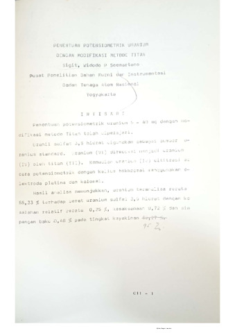 Sigit and Widodo Soemartono (1983) Penentuan potensiometrik uranium dengan modifikasi metode titan. Proceeding lokakarya kimia dan teknologi pemurnian bahan nuklir dan pertemuan ilmiah bahan murni, fisika dan instrumentasi nuklir: C11. pp. 1-9.