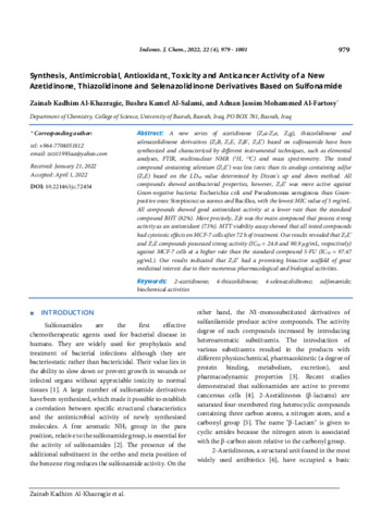 Zainab, Kadhim Al-Khazragie and Bushra, Kamel Al-Salami and Adnan, Jassim Mohammed Al-Fartosy (2022) Synthesis, antimicrobial, antioxidant, toxicity and anticancer activity of a new azetidinone, thiazolidinone and selenazolidinone derivatives based on sulfonamide. Indonesian Journal of Chemistry (Indones. J. Chem), 22 (4): 9. pp. 979-1001. ISSN 1411-9420 e_ISSN: 2460-1578