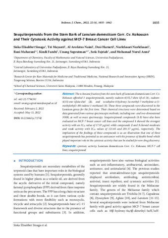 Siska, Elisahbet Sinaga and Tri, Mayanti and Al, Arofatus Naini and Desi, Harneti and Nurlelasari, Nurlelasari and Rani, Maharani and Kindi, Farabi and Unang, Supratman and Sofa, Fajriah and Mohamad, Nurul Azmi (2022) Sesquiterpenoids from the stem bark of lansium domesticum corr. cv. kokossan and their cytotoxic activity against MCF-7 breast cancer cell lines. Indonesian Journal of Chemistry (Indones. J. Chem), 22 (4): 13. pp. 1035-1042. ISSN 1411-9420 e_ISSN: 2460-1578