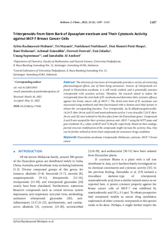 Sylvia, Rachmawati Meilanie and Tri, Mayanti and Nurlelasari, Nurlelasari and Desi, Harneti Putri Huspa and Rani, Maharani and Achmad, Zainuddin and Darwati, Darwati and Euis, Julaeha and Unang, Supratman and Jamaludin, Al Anshori (2022) Triterpenoids from stem bark of Dysoxylum excelsum and their cytotoxic activity against MCF-7 breast cancer cells. Indonesian Journal of Chemistry (Indones. J. Chem), 22 (4): 20. pp. 1107-1115. ISSN 1411-9420 e_ISSN: 2460-1578