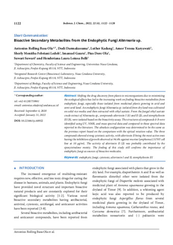 Antonius, Rolling Basa Ola and Dodi, Darmakusuma and Luther, Kadang and Amor, Tresna Karyawati and Sherly, Monitha Febriani Ledoh and Imanuel, Gauru and Pius, Dore Ola and Suwari, Suwari and Henderiana, Laura Loiusa Belli (2022) Bioactive secondary metabolites from the endophytic fungi Alternaria sp. Indonesian Journal of Chemistry (Indones. J. Chem), 22 (4): 22. pp. 1122-1128. ISSN 1411-9420 e_ISSN: 2460-1578