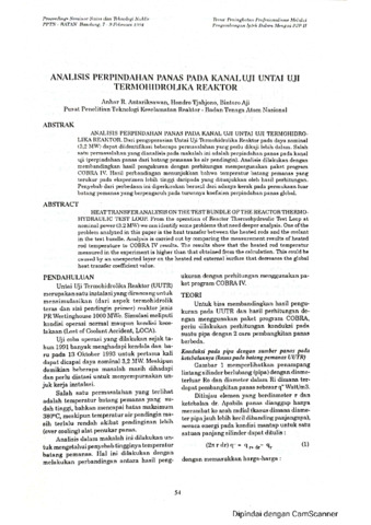 Dari pengoperasian Untai Uji Termohidrolika Reaktor pada daya nominal (3,2 MW) dapat diidentifikasi beberapa permasalahan yang yang perlu dikaji lebih dalam. Salah satu permasalahan yang dianalisis pada makalah ini adalah perpindahan panas pada kanal uji (perpindahan panas dari batang pemanas ke air pendingin). Analisis dilakukan dengan membandingkan hasil pengukuran dengan perhitungan mempergunakan paket program COBRA IV. Hasil perbandingan menunjukkan bahwa temperatur batang pemanas yang terukur pada eksperimen lebih tinggi daripada yang ditunjukkan oleh hasil perhitungan. Penyebab dari perbedaan ini diperkirakan berasal dari adanya kerak pada permukaan luar batang pemanas yang berpengaruh pada turunnya koefisien perpindahan panas global.