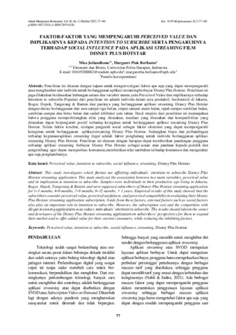 Niko, Juliandhono and Margaret, Pink Berlianto (2022) Faktor-faktor yang mempengaruhi perceived value dan implikasinya kepada intention to subscribe serta pengaruhnya terhadap social influence pada aplikasi streaming film Disney Plus Hotstar. Jurnal Manajemen Pemasaran, 16 (2): 3. pp. 77-86. ISSN 1907-235X