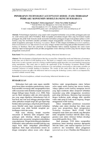 Perkembangan digitalisasi yang terjadi telah mengubah kebutuhan serta perilaku pelanggan pada saat ini, salah satunya pada sektor Perbankan. Bank merupakan perusahaan dengan fokus yang berorientasi kepada pelanggan dan pihak bank berusaha untuk memenuhi kebutuhan pelanggan dengan menciptakan aplikasi mobile banking yang bisa membantu transaksi perbankan dengan menggunakan smartphone. Penelitian ini bertujuan untuk menganalisa penerapan Technology Acceptance Model (TAM) dengan melibatkan perceived usefulness, behavioral intention to use dan attitude toward using sebagai variabel intervening pada perilaku konsumen mobile banking di Surabaya. Hasil dari penelitian ini memperlihatkan bahwa manfaat kegunaan dari suatu sistem teknologi dapat mempengaruhi minat perilaku penggunaan sistem teknologi tersebut yang disertai dengan sikap penggunaan secara positif.