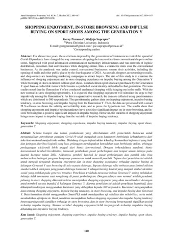 For almost two years, the restrictions imposed by the government of Indonesia to control the spread of Covid-19 pandemic have changed the way consumers shopping their necessities from conventional shops to online stores. Supported with good information communication technology infrastructures and vast network of logistic distribution, customers find conveniences while shopping online, thus, e-commerce rules over the conventional businesses. As the pandemic was under control, conventional businesses resume their activities, including the opening of malls and other public places by the fourth quarter of 2021. As a result, shoppers are returning to malls, and shop owners are launching marketing campaigns to attract buyers. The aim of this study is to examine the influence of shopping enjoyment and in-store shopping experience on impulse buying among the Generation Y while browsing in-store on limited edition sport shoes. Limited edition sport shoes are purchased by the Generation Y sport fans as collectible items which become a symbol of social identity embedded to that generation. Previous studies noted that the Generation Y often conducted unplanned shopping while hanging out in the malls. With the new normal in-store shopping opportunity, it is expected that shopping enjoyment will stimulate the urge to buy impulsively among the Generation Y. As this is a quantitative research, the data are collected using questionnaires which are distributed to 300 respondents. The questionnaire gathers data on shopping enjoyment, impulse buying tendency, in-store browsing, and impulse buying from the Generation Y. Then, the data are processed with a smart PLS software to obtain the validity and reliability tests, and to prove the hypothesis test. The results show that shopping enjoyment and impulse buying tendency have a positive significant impact on in-store browsing, and in�store browsing has a positive significant impact on impulse buying. However, the variable of shopping enjoyment brings more impact to impulse buying than the variable of impulse buying tendency.