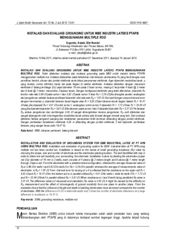 INSTALASI DAN EVALUASI GROUNDING UNTUK MBE INDUSTRI LATEKS PTAPB MENGGUNAKAN MULTIPLE ROD. Telah dilakukan instalasi dan evaluasi grounding pada MBE untuk industri lateks PTAPB menggunakan multiple rod. Instalasi didasarkan pada kebutuhan nilai tahanan pentanahan Rp yang kecil dengan cara pemilihan bentuk, ukuran dan jumlah elektrode serta lokasi penanaman elektrode. Agar diperoleh resistivitas tanah yang rendah, sumur ditimbun tanah liat pada bagian di sekitar elektrode. Instalasi dilakukan dengan menanam elektrode-2 batang tembaga (Cu) pejal diameter 16 mm pada 2 buah sumur, masing-2 berjumlah 4 buah @ 2 meter dan 8 buah @ 1 meter, menembus 2 lapisan tanah. Dengan konfigurasi elektrode yang telah ditentukan, diperoleh Rp terukur rata-rata 3,99 pada sumur I dan 5,82 pada sumur II atau Rpt = 2,36 jika dirangkai paralel, sedangkan dari pengukuran setelah keduanya dikopel diperoleh nilai rata-rata Rpt = 1,97 . Dari perhitungan secara trial and error dengan memvariasi , diperoleh tahanan tanah bagian atas R1 = 6,53 dan tahanan tanah bagian bawah R2 = 10,41 atau jika diparalel RpI = 4,01 untuk sumur I, sedangkan untuk sumur II diperoleh R1 = 7,72 dan R2 = 23,64 yang jika diparalel diperoleh Rp2 = 5,81 . Bila tahanan pada sumur I dan II diparalel diperoleh Rpt = 2,37 . Perbedaan Rpt antara pengukuran dan perhitungan 0,40 sangat dimungkinkan karena pengukuran Rpt sulit dilakukan dan sangat dipengaruhi oleh inhomogenitas resistivitas tanah antara satu tempat dengan tempat yang lain. Dari evaluasi diketahui bahwa pengaruh panjang dan kedalaman penanaman lebih dominan dibanding dengan jumlah elektrode. Dengan perbedaan kedalaman elektrode 0,55 m dibanding dengan jumlah elektrode 2 kali diperoleh perbedaan tahanan yang sangat besar yaitu 18,47 Ω.