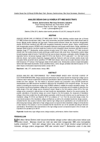 ANALISIS DESAIN DAN UJI KINERJA STT-MBE BASIS TRAFO. Telah dilakukan analisis desain dan uji kinerja STT-MBE berbasis transformator (trafo) 3 fase untuk menentukan penyebab spesifikasi teknis tidak dicapai pada uji kinerja. Metode analisis dilakukan dari tiga aspek. Pertama analisis dokumen desain dan konstruksi menggunakan standar IEC/SNI dan handbook trafo ABB untuk mengetahui kesesuaian komponen desain. Kedua, simulasi desain trafo menggunakan program VIZIMAG untuk mengetahui kebenaran perhitungan analitik desain. Ketiga, melakukan uji tegangan dadal komponen konstruksi padat dan insulasi oli untuk mengetahui desain keamanan tata letak komponen tegangan tinggi STT. Berdasarkan analisis pertama ternyata hampir 30% bahan komponen STT tidak memenuhi standar trafo. Dari analisis kedua ternyata perhitungan analitik desain trafo sudah benar. Berdasarkan analisis ketiga ternyata tegangan dadal oli terukur 3 kali lebih kecil dari asumsi desain keamanan, sedangkan struktur fleksiglas bisa digunakan karena mempunyai tegangan dadal 45 kV/mm dan flashover 60 kV pada jarak 1 cm. Dari hasil review dokumen desain, hasil analisis eksperimen tegangan dadal dan flashover serta dari simulasi analisis desain trafo terungkap bahwa penyebab utama spesifikasi STT-MBE tidak dicapai, karena asumsi angka keamanan desain tata letak komponen STT sebesar 2 kali tegangan dadal oli trafo adalah aman. Berdasarkan analisis ini dapat disimpulkan bahwa trafo tidak dapat dioperasikan sesuai spesifikasi teknis, namun dengan perbaikan tata letak komponen STT di dalam bejana oli diharapkan dapat dioperasikan sampai 260 kV.
