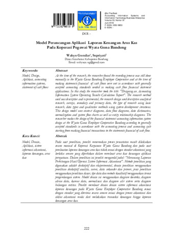 | Uncontrolled Keywords: | Model, Desain, Aplikasi, Sistem informasi akuntansi, Laporan keuangan, Arus kas |