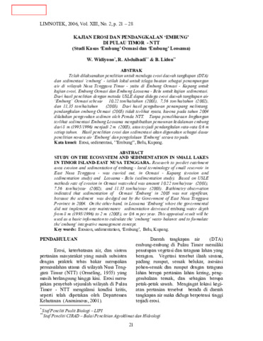 Telah dilaksanakan penelitian untuk menduga erosi daerah tangkapan (DTA) dan sedimentasi ’embung’ - istilah lokal untuk telaga buatan sebagai penampungan air di wilayah Nusa Tenggara Timur - yaitu di Embung Oemasi - Kupang untuk kajian erosi, Embung Oemasi dan Embung Leosama - Belu untuk kajian sedimentasi. Dari hasil penelitian dengan metoda USLE dapat diduga erosi daerah tangkapan air ‘Embung’ Oemasi sebesar 10,22 ton/ha/tahun (2001), 7,56 ton/ha/tahun (2002), dan 11,35 ton/ha/tahun (2003). Dari hasil pengukuran penampang melintang, pendangkalan embung Oemasi (2005) tidak terlihat nyata, karena pada tahun 2004 dilakukan pengerukan sedimen oleh Pemda NTT. Tanpa pemeliharaan lingkungan terlihat sedimentasi Embung Leosama mengakibatkan penurunan kedalaman embung dari 8 m (1995/1996) menjadi 2 m (2005), atau terjadi pendangkalan rata-rata 0,6 m setiap tahun. Hasil penelitian erosi dan sedimentasi akan digunakan sebagai dasar penelitian neraca air ‘Embung’ dan pengelolaan ‘Embung’ secara terpadu.
