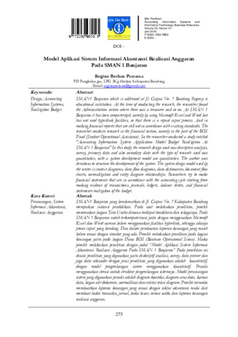 Regine, Berlian Pratama (2018) Model aplikasi sistem informasi akuntansi realisasi anggaran pada SMAN 1 Banjaran. @The Best : Accounting Information Systems and Information Technology Business Enterprise, 3 (1): 5. pp. 275-287. ISSN 2252-9853