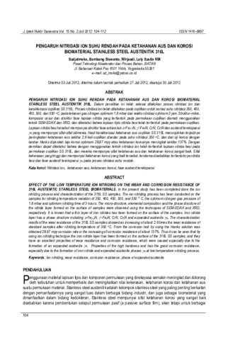 PENGARUH NITRIDASI ION SUHU RENDAH PADA KETAHANAN AUS DAN KOROSI BIOMATERIAL STAINLESS STEEL AUSTENITIK 316L. Dalam penelitian ini telah selesai dilakukan proses nitridasi ion dan karakterisasi cuplikan SS 316L. Proses nitridasi ion telah dilakukan pada cuplikan untuk variasi suhu nitridasi 350, 400, 450, 500, dan 550 oC, pada tekanan gas nitrogen optimum 1,8 mbar dan waktu nitridasi optimum 3 jam. Struktur-mikro, komposisi unsur dan struktur fase lapisan nitrida yang terbentuk pada permukaan cuplikan diamati menggunakan teknik SEM-EDAX dan XRD, dan diketahui bahwa lapisan tipis nitrida besi telah terbentuk pada permukaan cuplikan. Lapisan nitrida besi tersebut mempunyai struktur fase antara lain -Fe2-3N, ’-Fe4N, CrN, Cr2N dan austenit terekspansi N yang mempunyai sifat-sifat istimewa. Hasil karakterisasi ketahanan aus cuplikan SS 316L menunjukkan terjadinya peningkatan ketahanan aus sekitar 2,6 kali cuplikan standar pada suhu nitridasi 350 oC, dan dari uji korosi dengan larutan Hanks diperoleh laju korosi optimum 29,87 mpy atau ketahanan korosinya meningkat sekitar 137%. Dengan demikian dapat diketahui bahwa dengan menggunakan teknik nitridasi ion telah terbentuk lapisan nitrida besi pada permukaan cuplikan SS 316L, dan mereka mempunyai sifat ketahanan aus dan ketahanan korosi sangat baik. Sifat kekerasan yang tinggi dan mempunyai ketahanan korosi yang baik tersebut, terutama disebabkan terbentuknya nitrida besi dan fase austenit terekspansi N pada proses nitridasi suhu rendah.