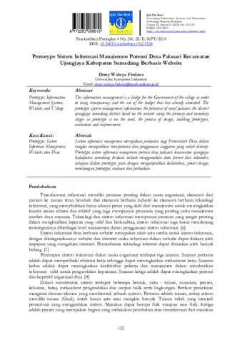 Dony, Waluya Firdaus (2018) Prototype sistem informasi manajemen potensi Desa Palasari Kecamatan Ujungjaya Kabupaten Sumedang berbasis website. @The Best : Accounting Information Systems and Information Technology Business Enterprise, 3 (2): 6. pp. 123-129. ISSN 2252-9853