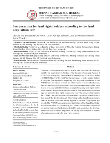 Dhaniar, Eka Budiastanti and Khotbatul, Laila and Nahdiya, Sabrina and Diah, Aju Wisnuwardhani and Selvia, Wisuda (2022) Compensation for land rights holders according to the land acquisition law. Jurnal Cakrawala Hukum, 13 (2): 3. pp. 135-144. ISSN 2356-4962