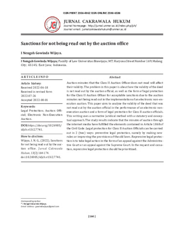 I Nengah Gowinda Wijaya (2022) Sanctions for not being read out by the auction office. Jurnal Cakrawala Hukum, 13 (2): 6. pp. 164-174. ISSN 2356-4962