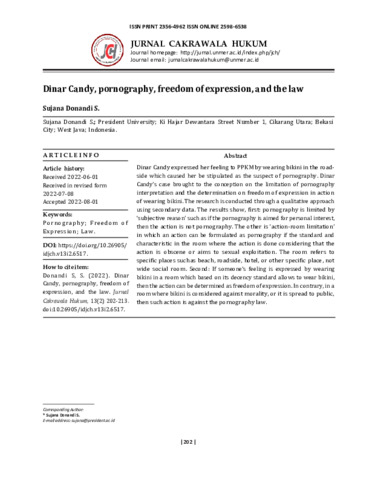 Sujana Donandi S (2022) Dinar Candy, pornography, freedom of expression, and the law. Jurnal Cakrawala Hukum, 13 (2): 10. pp. 202-213. ISSN 2356-4962