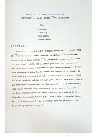 Telah dilakukan penelitian untuk menentukan konsentrasi Al dalam larutan 99m Tc perteknetat secara cepat, mudah, dan siap pakai (sistem kit). Sistem penentuan yang digunakan adalah menyerapkan reagen pengompleks Al pada kertas whatman. Dengan cara meneteskan 1 tetes larutan contoh dan membandingkan dengan larutan standar, konsentrasi Al dalam larutan dapat ditentukan. Untuk itu sudah dilakukan seleksi beberapa jenis kertas, pemakaian beberapa zat pengompleks misalnya aluminon, kromazurol S, dan 8 hidroksikuinolin dalam beberapa macam konsentrasi dalam serta pengaruh temperatur pengeringan terhadap intensitas warna kompleks. Dari seleksi diatas didapatkan bahwa pembuatan kit yang terbaik ialah menggunakan larutan 0,047% kromazhurol S yang diserapkan pada kertas whatman 3mm, temperatur pengeringan , 40 0C.