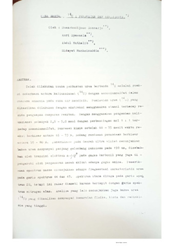 Telah dilakukan usaha pembuatan urea bertanda 14C melalui reaksi sederhana antara kaliusianat (14C) ammoniumsulfat dalam suasana amonia pada suhu air mendidih. Pemisahan urea (14C) yang dihasilkan dilakukan dengan ekstraksi menggunakan etanol terhadap residu penguapan campuran reaktan. Dengan menggunakan pengemban kaliumsianat sebanyak 2,5-5,0 mmol dengan perbandingan mol 1 : 1 terhadap amoniumsulfat, rendaman kimia setelah 60-75 menit waktu reaksi berkisar antara 65-73%, sedang, rendaman penandaan berkisar antara 70-80%. Pemeriksaan pada daerah ultra violet menunjukan bahwa urea mempunyai panjang gelombang maksimum pada 198 nm, disebabkan oleh transisi elektron pada gugus karbonil yang juga dipengaruhi oleh pergeseran merah akibat adanya gugus amina. Pemeriksaan spektrum massa menunjukan adanya fragmentasi karakteristik urea pada garis spektrum 44 dan 43 . Spektrum utama diduga pada garis spektrum 28, tapi ini sukar diamati karena berimpit dengan garis spektrum nitrogen alam. Analisa yang lain menunjukan juga bahwa urea (14C) yang dihasilkan m empunyai kemurnian fisika, kimia dan radio kimia yang tinggi.