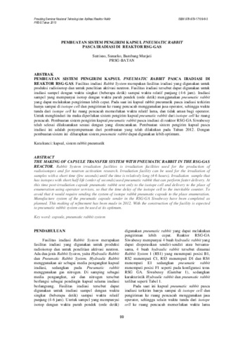 PEMBUATAN SISTEM PENGIRIM KAPSUL PNEUMATIC RABBIT PASCA IRADIASI DI REAKTOR RSG-GAS. Fasilitas iradiasi Rabbit System merupakan fasilitas iradiasi yang digunakan untuk produksi radioisotop dan untuk penelitian aktivasi neutron. Fasilitas iradiasi tersebut dapat digunakan untuk iradiasi sampel dengan waktu singkat (beberapa detik) sampai waktu relatif panjang (4-6 jam). Iradiasi sampel yang mempunyai isotop dengan waktu paruh pendek (orde detik) menggunakan pneumatic rabbit yang dapat melakukan pengiriman lebih cepat. Pada saat ini kapsul rabbit pneumatik pasca iradiasi terkirim hanya sampai di isotope cell dan pengiriman ke ruang pencacah menggunakan jasa operator, sehingga waktu tunda dari isotope cell ke ruang pencacah memerlukan waktu relatif lama, dan tidak aman bagi operator. Untuk menghindari itu maka diperlukan sistem pengirim kapsul pneumatic rabbit dari isotope cell ke ruang pencacah. Pembuatan sistem pengirim kapsul pneumatic rabbit pasca iradiasi di reaktor RSG-GA Siwabessy telah selesai dilaksanakan sesuai dengan yang direncanakan. Pembuatan sistem pengirim kapsul pasca iradiasi ini adalah penyempurnaan dari pembuatan yang telah dilakukan pada Tahun 2012. Dengan pembuatan sistem ini diharapkan sistem pneumatic rabbit dapat digunakan lebih optimum.