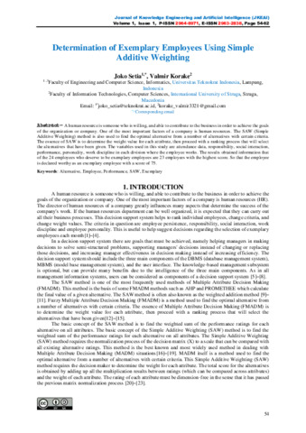 Joko, Setia and Valmir, Korake (2022) Determination of exemplary employees using simple additive weighting. Journal Of Knowledge Engineering And Artificial Intelligence (JKEAI), 1 (1). pp. 54-62. ISSN 2964-8971