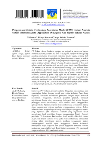 Karyawan PT Telkom Access Surakarta ditugaskan menyediakan dan menyiapkan bahan dengan jumlah dan waktu terbatas. Agar dapat dipenuhi, karyawan melakukan pekerjaan dengan cepat termasuk koordinasi, pengadaan, produksi, pasokan produk, termasuk administrasi harian dan memproses informasi dari teknisi kepada pelanggan untuk membuatnya lebih mudah untuk menggunakan aplikasi Alista. Apakah persepsi desain antarmuka, kemudahan sistem, sikap penerimaan sistem, perilaku menggunakan sistem diukur seberapa besar pengaruhnya terhadap kondisi nyata penggunaan sistem yang dipercaya oleh karyawan. Metode yang digunakan untuk pengukuran hasil penelitian dengan menggunakan TAM. Sampel penelitian 78 karyawan. Berdasarkan hasil analisis diketahui bahwa 35,2% dari empat variabel bebas yaitu desain antarmuka, kemudahan sistem, sikap penerimaan sistem, perilaku penggunaan sistem mempengaruhi kondisi nyata penggunaan sistem informasi. Berdasarkan hasil kuisioner dari semua responden terhadap variabel pertanyaan yang diteliti, hasil TAM dalam persentase 44% menjawab sangat setuju dan 55% menjawab setuju.