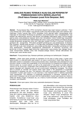 I, Made Agus Mahendra (2022) Analisis ruang terbuka hijau dalam perspektif pembangunan kota berkelanjutan (studi kasus kawasan pusat Kota Denpasar, Bali). Jurnal Ilmiah VASTUWIDYA, 5 (1): 6. pp. 41-49. ISSN 2620-3448