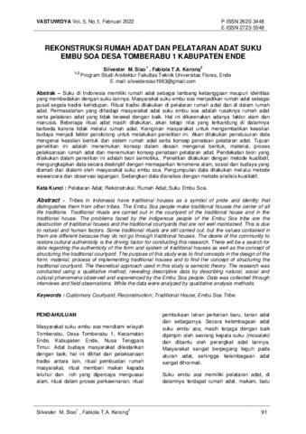 Silvester, M. Siso and Fabiola, T.A. Kerong (2022) Rekonstruksi rumah adat dan pelataran adat Suku Embu Soa Desa Tomberabu 1 Kabupaten Ende. Jurnal Ilmiah VASTUWIDYA, 5 (1): 12. pp. 91-98. ISSN 2620-3448