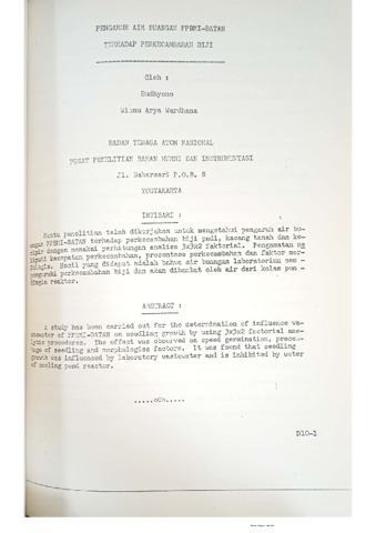 A studied has been carried out for the determination of influence waste water of PPBMI-BATAN on seedling growth by using 3x3x2 factorial analitic procedures. The effect was absorved on speed germination, precentage of seedling and morphologies factors. It was found that seedling growth was influenced by laboratory wastewater and is inhibited water of cooling pond reactor.