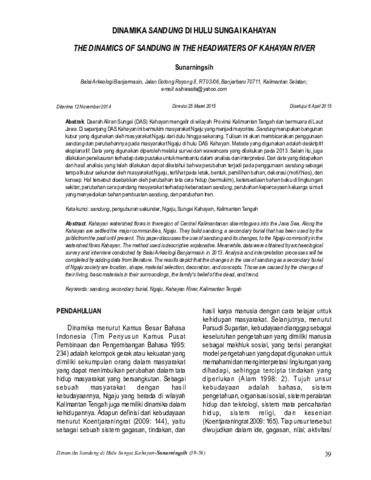 Daerah Aliran Sungai (DAS) Kahayan mengalir di wilayah Provinsi Kalimantan Tengah dan bermuara di Laut Jawa. Di sepanjang DAS Kahayan ini bermukim masyarakat Ngaju yang menjadi mayoritas. Sandung merupakan bangunan kubur yang digunakan oleh masyarakat Ngaju dari dulu hingga sekarang. Tulisan ini akan membicarakan penggunaan sandung dan perubahannya pada masyarakat Ngaju di hulu DAS Kahayan. Metode yang digunakan adalah deskriptif eksplanatif. Data yang digunakan diperoleh melalui survei dan wawancara yang dilakukan pada 2013. Selain itu, juga dilakukan penelusuran terhadap data pustaka untuk membantu dalam analisis dan interpretasi. Dari data yang didapatkan dan hasil analisis yang telah dilakukan dapat diketahui bahwa perubahan terjadi pada penggunaan sandung sebagai tempat kubur sekunder oleh masyarakat Ngaju, terlihat pada letak, bentuk, pemilihan bahan, dekorasi (motif hias), dan konsep. Hal tersebut disebabkan oleh perubahan tata cara hidup (bermukim), ketersediaan bahan baku di lingkungan sekitar, perubahan cara pandang masyarakat terhadap keberadaan sandung, perubahan kepercayaan keluarga si mati yang menyediakan bahan pembuatan sandung, dan perubahan tren.