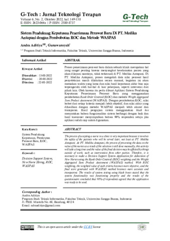Andra, Aditiya and Gunawansyah, Gunawansyah (2022) Sistem pendukung keputusan penerimaan perawat baru Di PT. Medika Antapani dengan pembobotan ROC dan metode WASPAS. G-TECH: Jurnal Teknologi Terapan, 6 (2): 8. pp. 149-158. ISSN 2580-8737